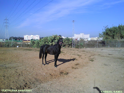 Esta mañana hemos salido a entrenar con la yegua sin las botas, el entrenamiento lo hemos empezado con las precauciones propias de los solos seis meses que lleva con la técnica Barefoot, hemos escogido unos terrenos más bien blandos, tanto falto de piedras como con zonas de hierba corta.