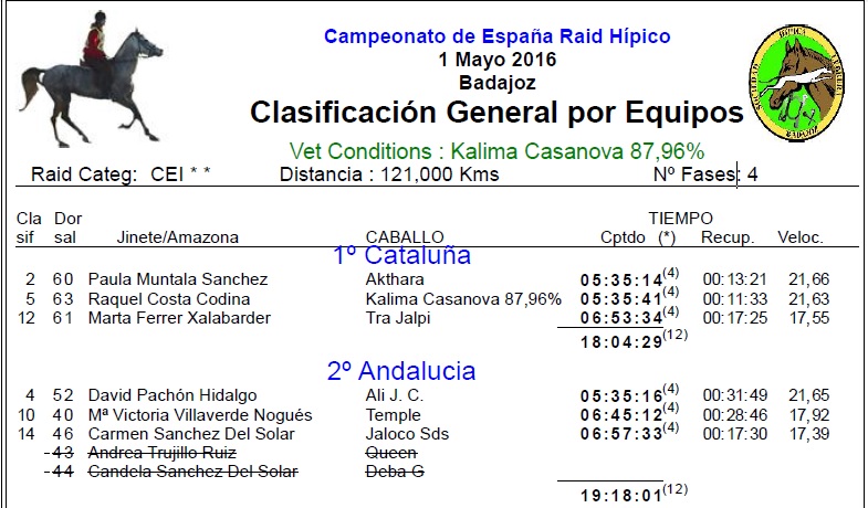 Clasificación del Campeonato de España de Raid de Jóvenes Jinetes por Equipos, Campeonato que se ha celebrado hoy 1 de Mayo de 2016 en Badajoz.