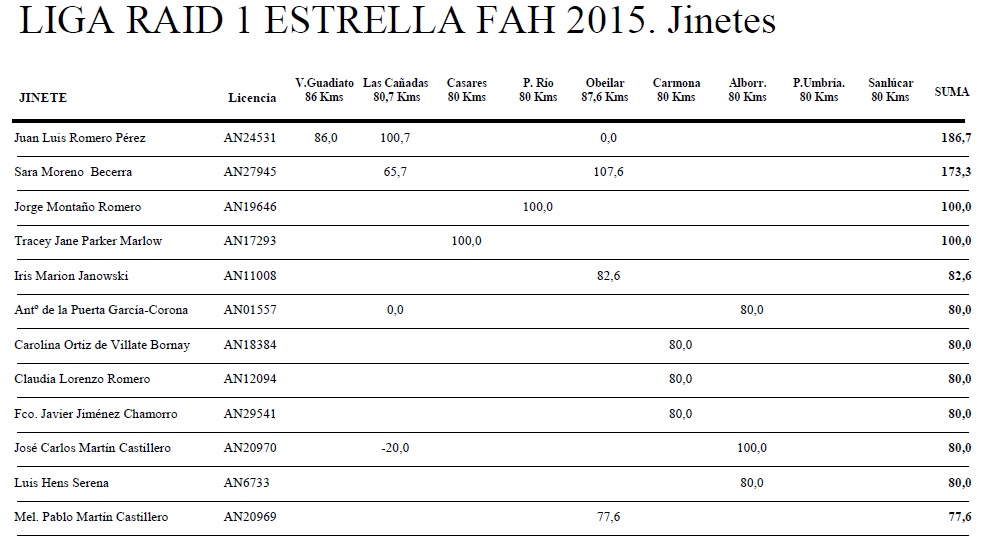 LIGA RAID 1 ESTRELLA FAH 2015. Jinetes.