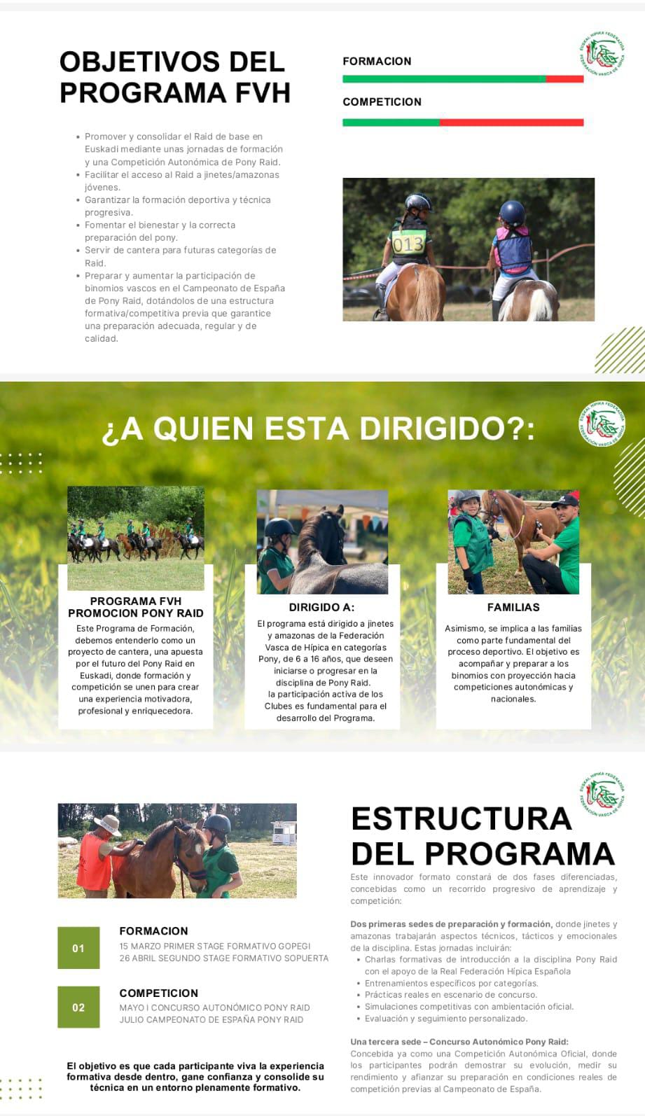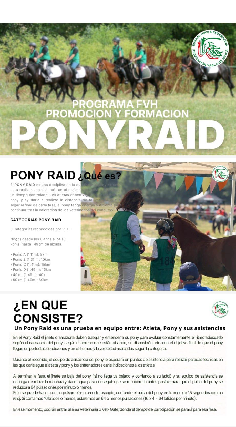 La Federación Vasca de Hípica y a través de Ana Loidi Basterretxea, publica en las redes el Pony Raid, una modalidad dedicada a nuestros aficionados jóvenes, que son el futuro de la disciplina, y donde explican todo el recorrido informativo de este proyecto de Formación y Promoción.