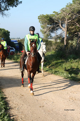 A las 9 de la mañana han salido los 30 binomios de las pruebas CEI*-CEN*-CET* y CET O* y CEN O* de 80 Km., ya con mejor tiempo, aunque algunos jinetes todavía llevaban puestas ropas de abrigo, como veis a Marta Hidalgo, que no se le reconoce con ese pasa montaña azul.A las 10 de la mañana salen los 26 participantes de la prueba de Promoción para recorrer los 48 Km. en dos fases.
