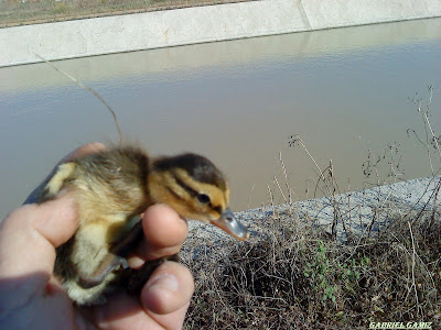 - Después de ver todo el espectáculo de la pata en el canal, me baje de la yegua y recogí al pollo de la pata, observándolo y haciéndole unas fotos para recordar el incidente.