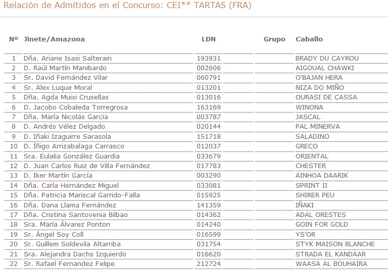Relación de los españoles admitidos en las distintas pruebas del Raid Hípico de Tartas (FRA), una vez finalizado el plazo de inscripción, prueba que se correrá los días 24-25 de Octubre de 2015.