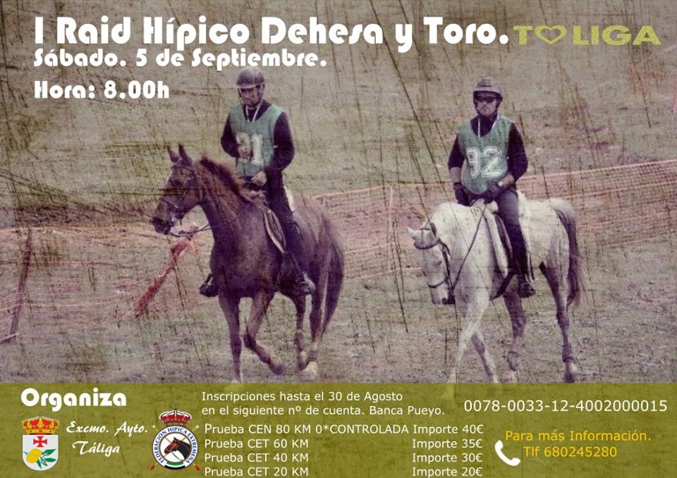 El próximo día 5 de Septiembre de 2015 se celebrara el Raid Hípico Dehesa y el Toro, organizado por el Ayuntamiento de Táliga, bajo la dirección de la Federación Hípica Extremeña.