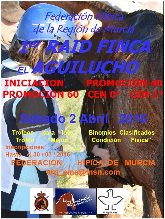 NoticiasRAIDRAID 2016 I Raid Hípico Finca El Aguilucho ( Murcia). 11 marzo, 2016 Gabriel Gamiz 0 comentarios (Murcia), I Raid Hípico Finca El Aguilucho I Raid Hípico Finca El Aguilucho ( Murcia). El próximo día 2 de Abril de 2016, se correrá el I Raid Hípico Finca el Aguilucho (Murcia). CEN* CENO* Promoción de 60Km. Promoción de 40 Km. Iniciación de 20 Km. Saludos de Gabriel.