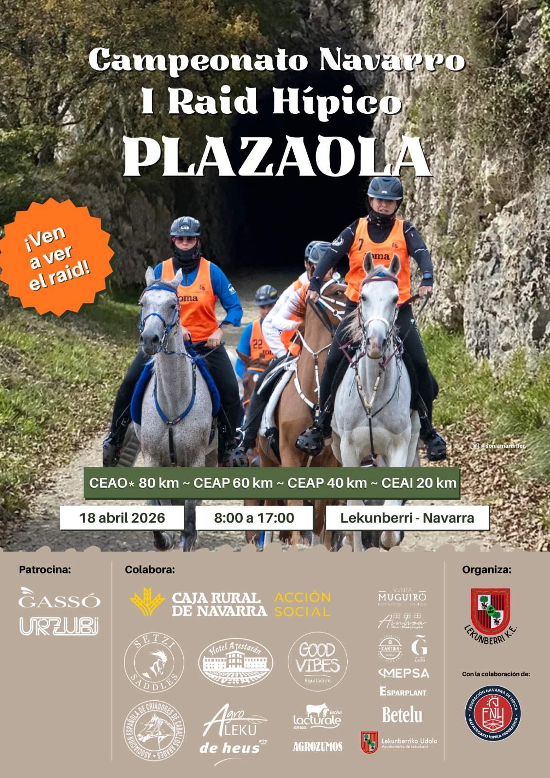 El día 18 de Abril de 2026, se correrá el I Raid Hípico Plazaola en Lekunberri (Navarra). Campeonato Navarro de Raid. Prueba organizada por la Sección de Equitación Lekunberri Kirol Elkartea. Colabora la Federación Navarra de Hípica.