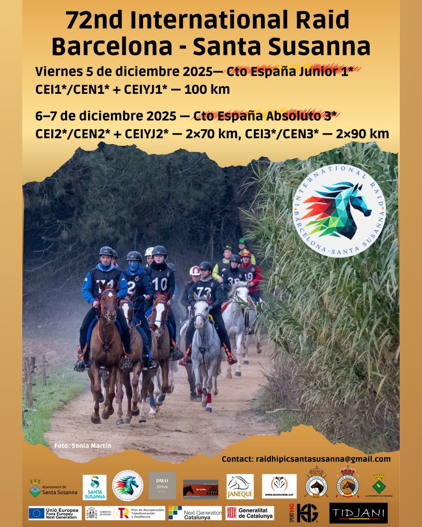 Las carreras de la septuagésima segunda edición de los Raids de Barcelona Santa Susanna, decano de la competición nacional y europea, se disputarán este fin de semana, del viernes 5 al domingo 7 de diciembre. El programa constará de cinco carreras de categoría FEI Internacional: dos carreras de una estrella, CEI1* y CEIYJ1*, el viernes 5; dos carreras de dos estrellas, CEI2** y CEIYJ2**, y una de tres estrellas CEI3***, las tres en dos días, sábado 6 y domingo 7. El Campeonato de España de Raid 2025 Absoluto se disputará sobre el CEI3***, y el Campeonato de España Júnior 1 estrella sobre el CEIYJ1*.