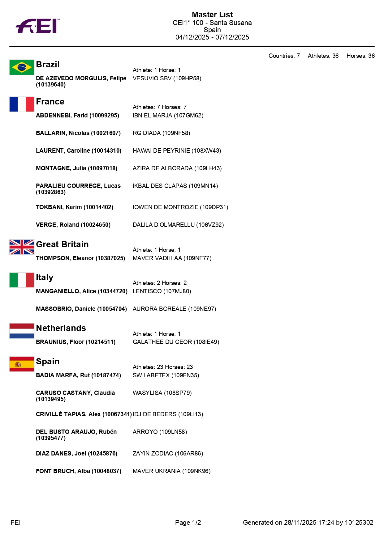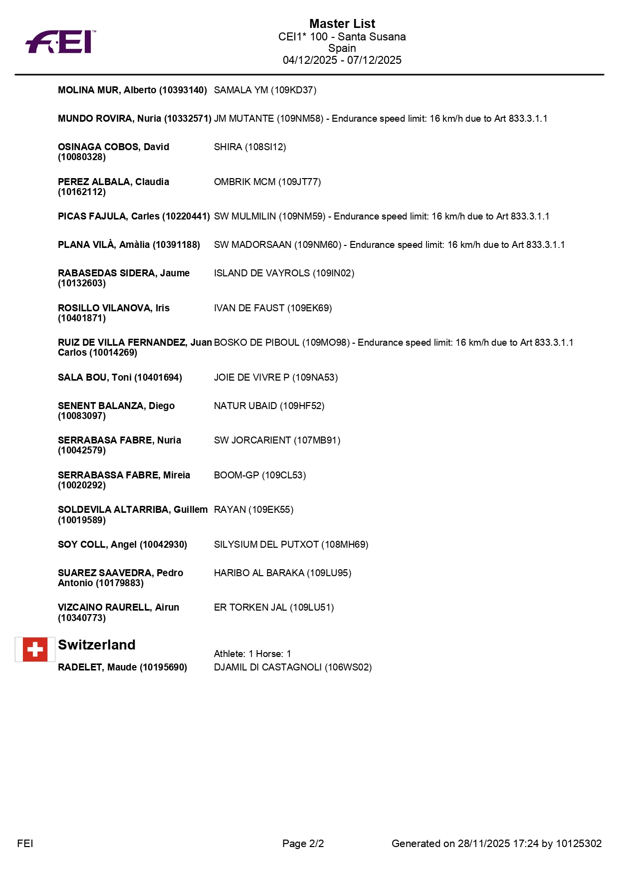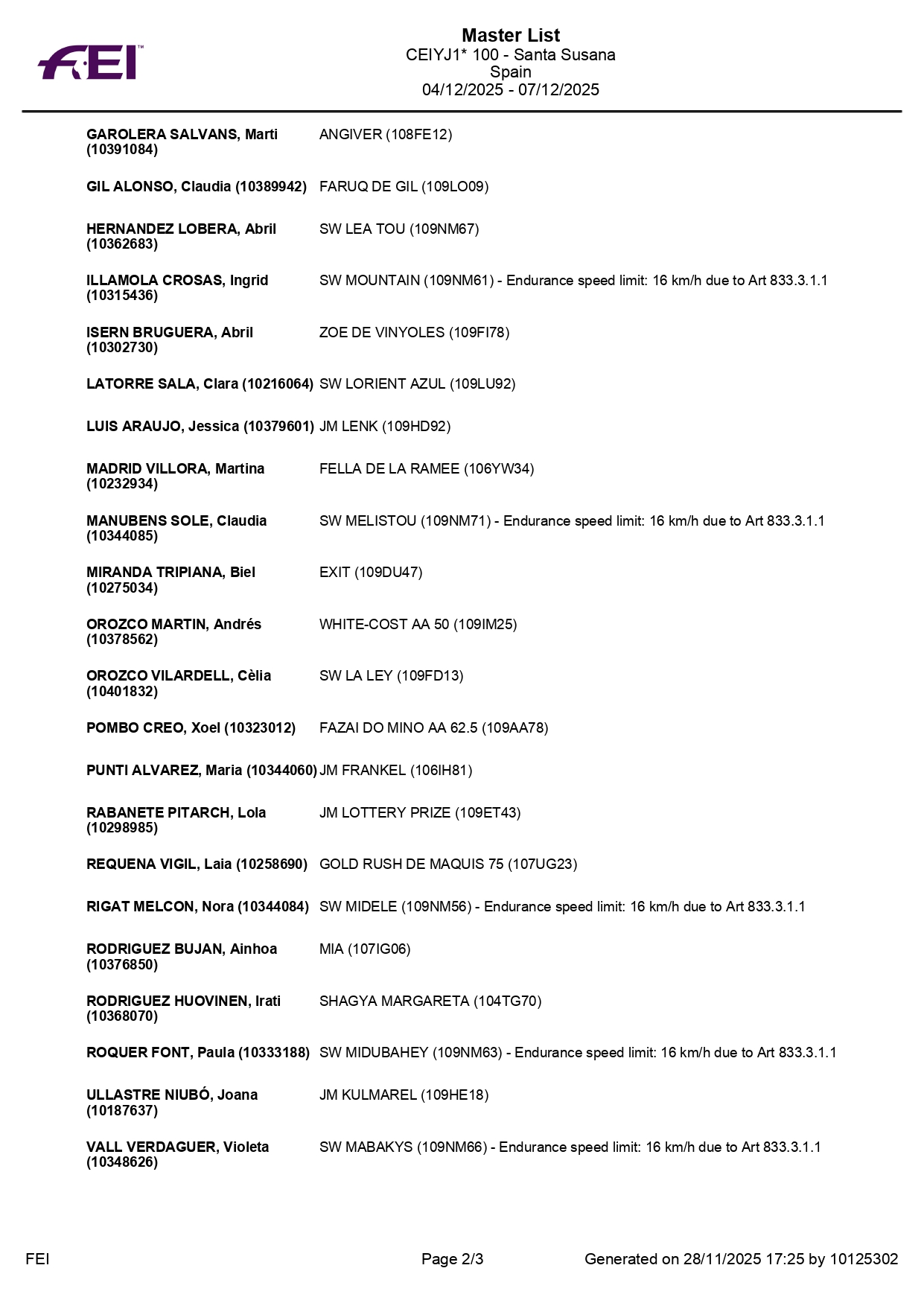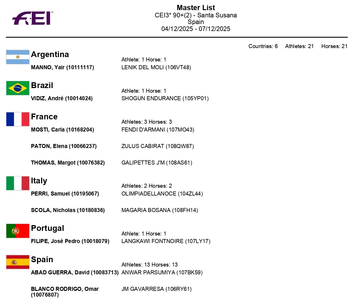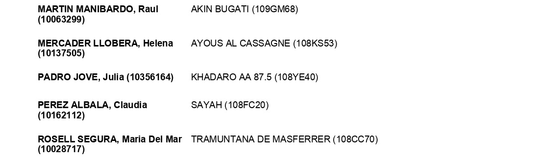 Estos son todos los Inscritos en el 72º Raid Hípico Internacional de Santa Susana (Barcelona). Campeonato de España Absoluto y Campeonato de España Junior 1*. Prueba organizada por el Ayuntamiento de Santa Susana. Que se correrá los días 5-7 de Diciembre de 2025.