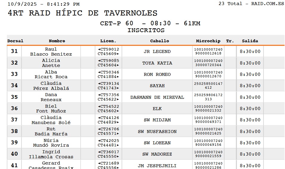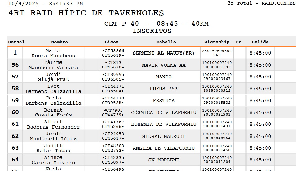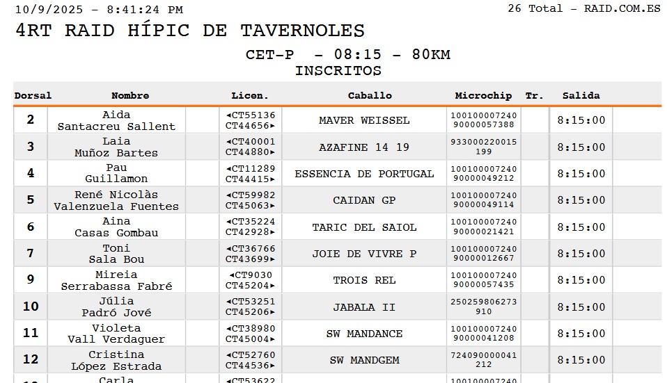 Estos son los Inscritos en el IV Raid Hípico de Tavernoles (Barcelona), prueba organizada por Dachas Endurante y Federación Hípica Catalana. Que se correrá el día 11 de Octubre de 2025.
