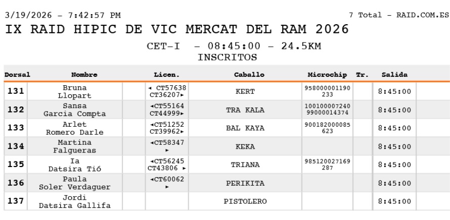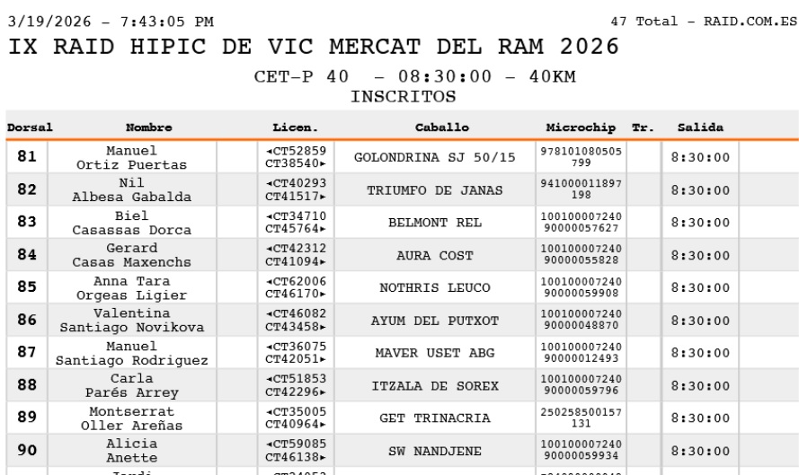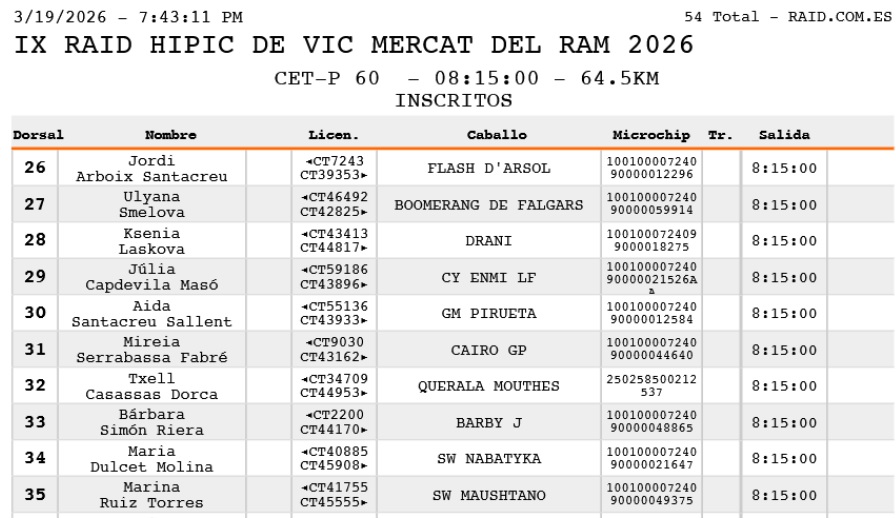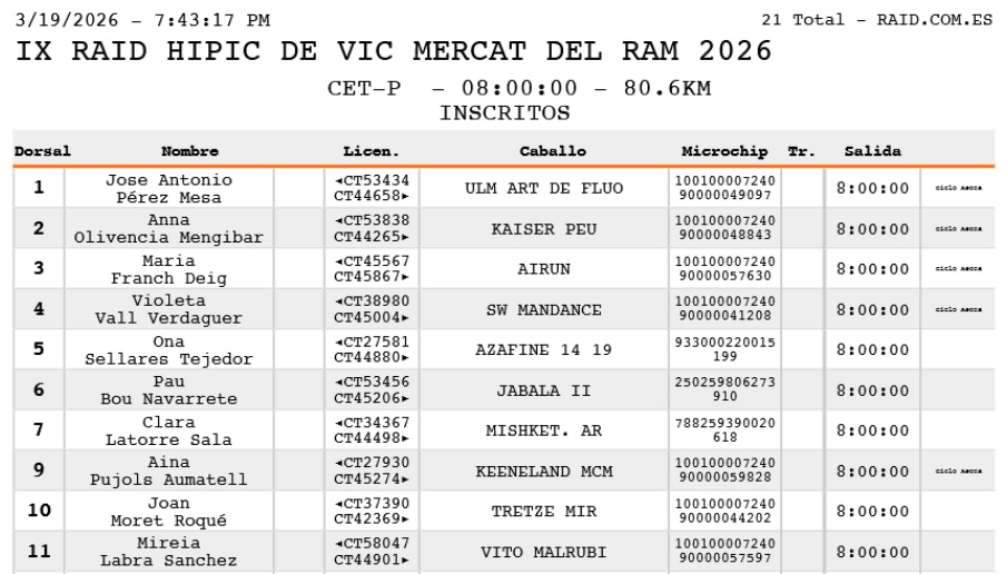 Inscritos en el IX Raid Hípico de Vic Mercat del Ram 2026. ( Barcelona).