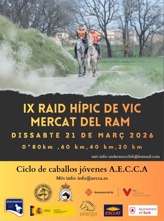 Estos son los Inscritos en el IX Raid Hípico de Vic Mercat del Ram 2026 (Barcelona) y Ciclo de Caballos Jóvenes de Raid de AECCA, prueba organizada por Endurance Club Hipic. Que se correrá el día 21 de Marzo de 2026.