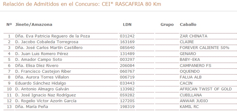 Relación de los admitidos en el Raid Hípico «Santa María del Paular» en la Villa de Rascafria (Madrid) Copa de S.M. El Rey 2015, una vez que ha finalizado el plazo de inscripción, prueba que se celebrará los próximos días 6-7 de Abril de 2015.
