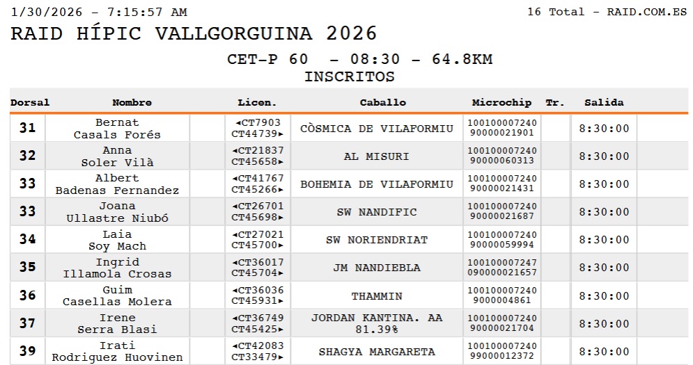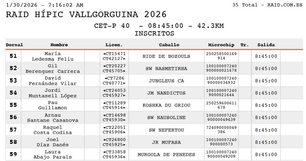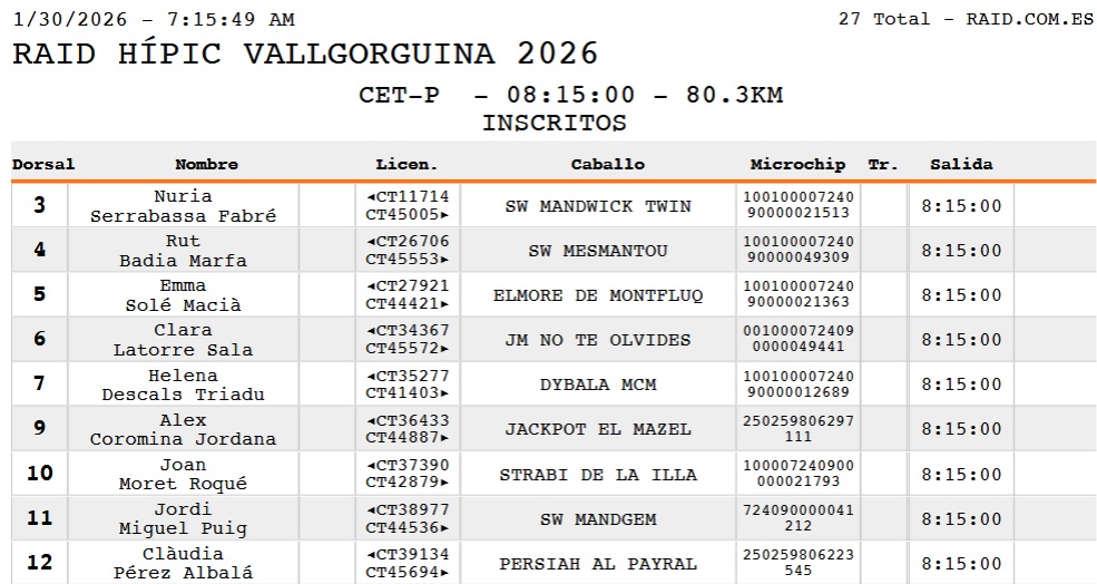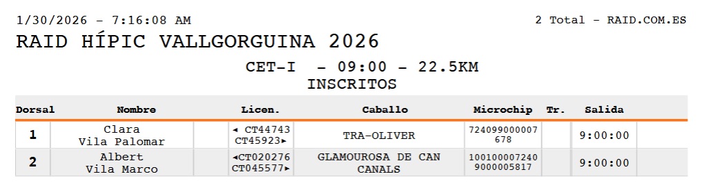 Estos son los Inscritos en las pruebas Internacionales del Raid Hípico Vallorguina (Barcelona), Ciclo de Caballos Jóvenes de AECCA, prueba organizada por el Endurance Club Hipic Y CLUB HÍPIC BAIX MONTSENY. Que se correrá el día 31 de Enero de y 1 de Febrero de 2026.