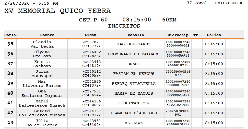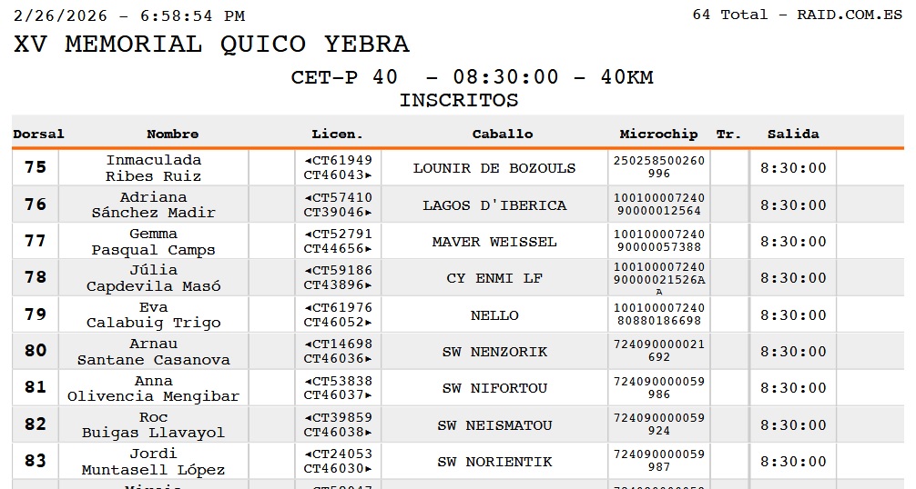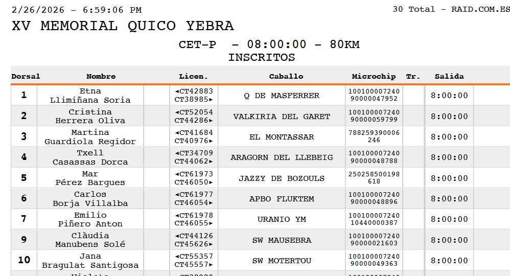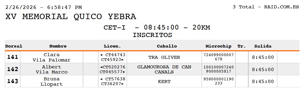 Estos son los Inscritos en el XV Memorial Quico Yebra en San Feliu Sasserra, (Barcelona), prueba organizada por la Associación Hípica de Santpedor Equiset. Que se correrá el día 28 de Febrero de 2026.