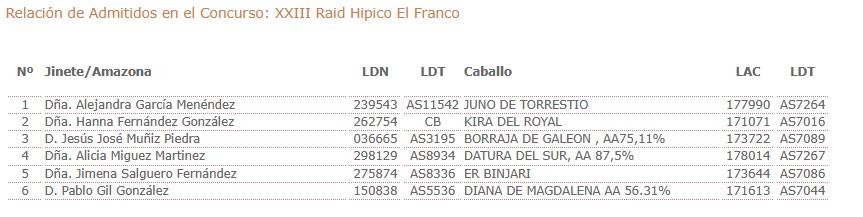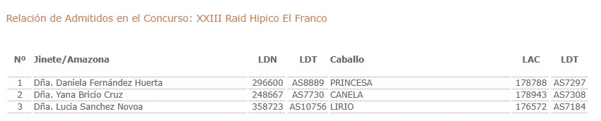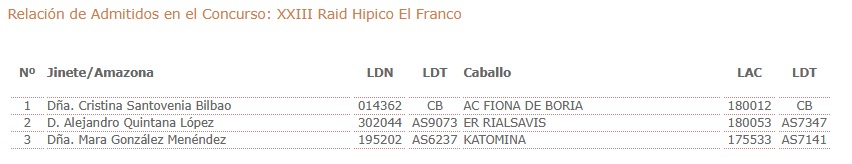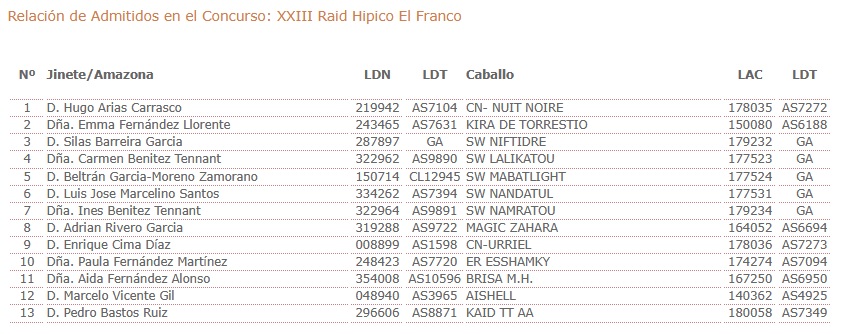Estos son los Inscritos en el XXIII Raid Hípico de El Franco La Caridad (Asturias). Prueba organizada por el Club Valcarjo. Que se correrá el día 25 de Abril de 2026.