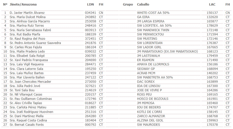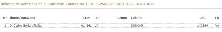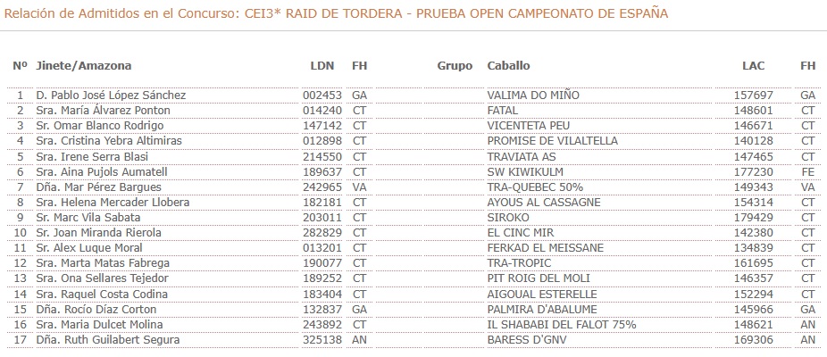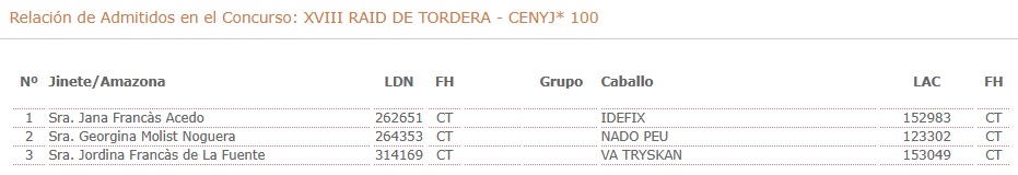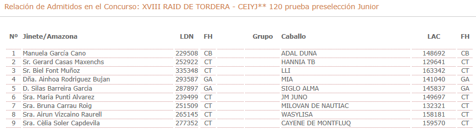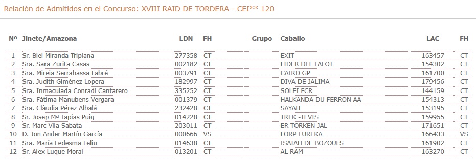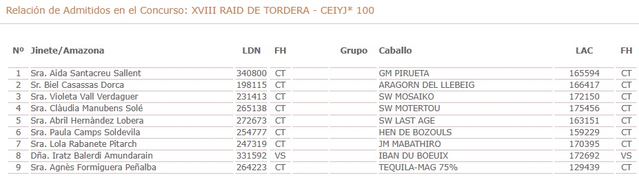 Estos son los Inscritos en el XXVIII Raid Hípico de Tordera (Barcelona). Campeonato de España de Raid Absoluto. Prueba organizada por el CLUB HIPIC DE GARBI. Que se correrá el día 10 y 11 de Abril de 2026.