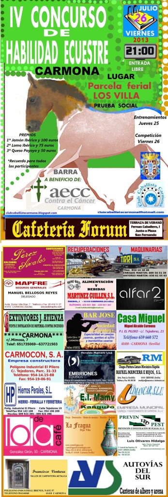 Nuestro amigo Francisco Eslava, que este pasado sábado acudía al II Raid Hípico «Entre el Sol y la Luna», con un amplio equipo de raid, ahora realiza un Concurso de Habilidad Ecuestre, en su ciudad, en el Recinto Ferial Las Villa, en beneficio de aecc (contra el cancer), el Jueves 25 de Julio y Viernes 26 a las 21 horas.