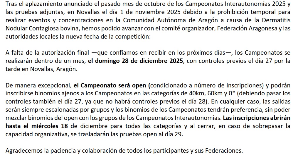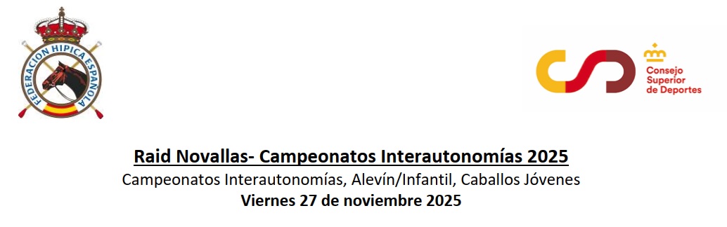 La Real Federación Hípica Española nos informan que la nueva fecha prevista para el Raid Novallas – Campeonatos Interautonomías 2025, a falta de la autorización final, será el domingo 28 de Diciembre.