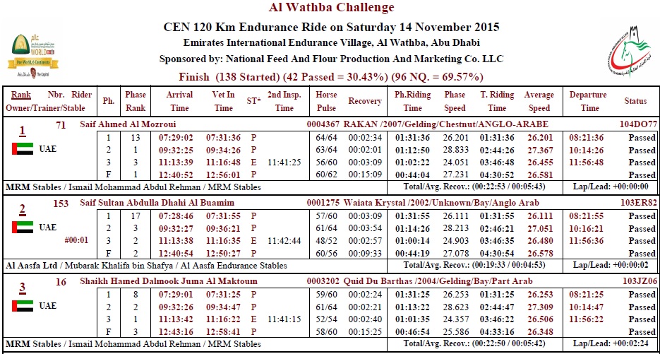 Resultados de la Al Wathba Challenge Endurance Ride (Abu Dhabi), prueba que se corrió en el día de ayer 14 de Noviembre de 2015.