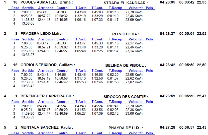 Los resultados provisionales de la tercera fase de este Ctº de España de Raid Júnior, ya los tenemos, siguen corriendo y no solo no han bajado las velocidades, sino que las han subido a 23,9Km/h, la primera clasificada y hasta el cuarto puesto han pasado de los 23Km/h. esta fase.