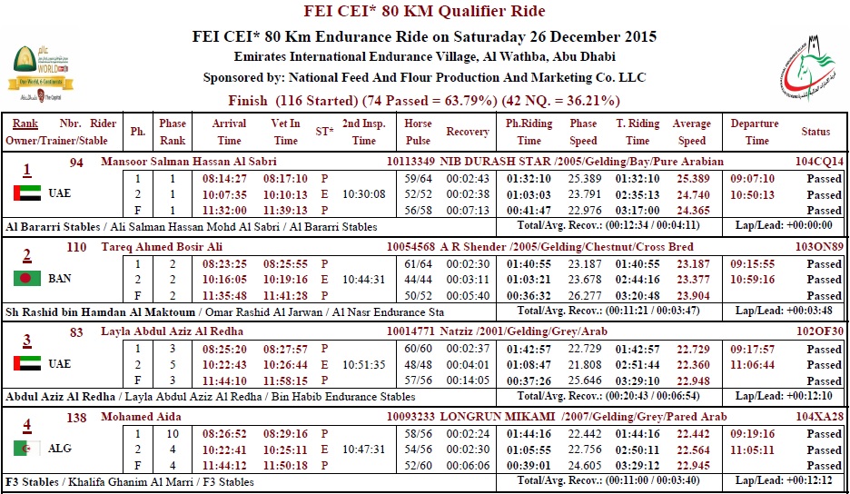 Resultados de la Al Wathba Cup for Private Owners y Qualifier Ride, pruebas que se han corrido en el día de hoy 26 de Diciembre de 2015 en Abu Dhabi.