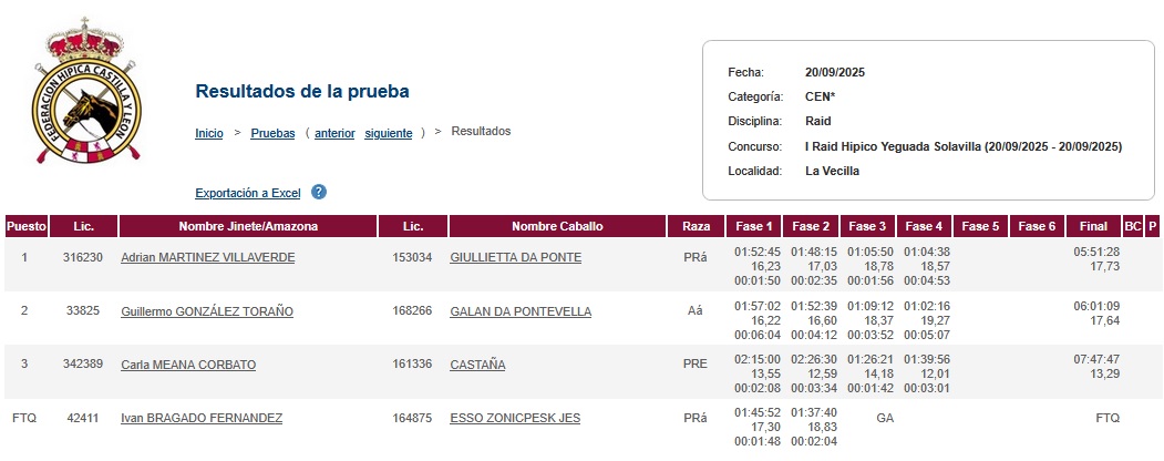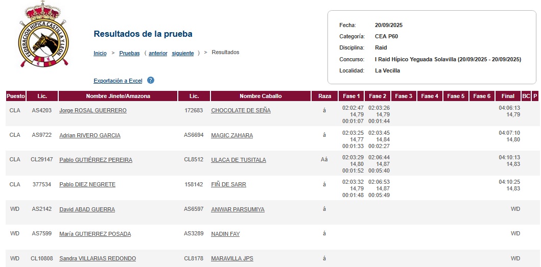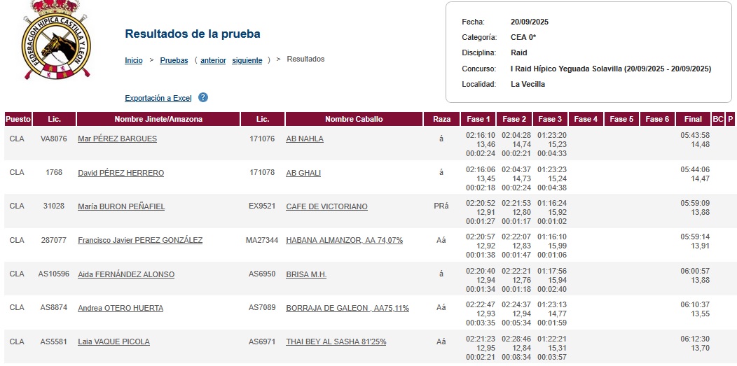 Estos son los Resultados del I Raid Hípico Yeguada Solavilla en La Vecilla (León), Y ciclo de Caballos Jóvenes de AECCA, prueba organizada por la Yeguada Solavilla y Selena G. Soto. Que se ha corrido el día 20 de Septiembre de 2025.