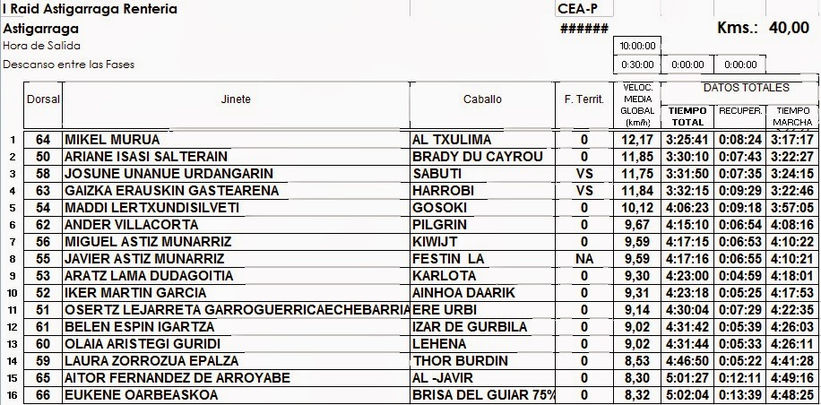 Resultados del I Raid Hípico de Astigarraga-Renteria (Guipuzcoa), celebrado el pasado domingo 16 de Febrero de 2014.