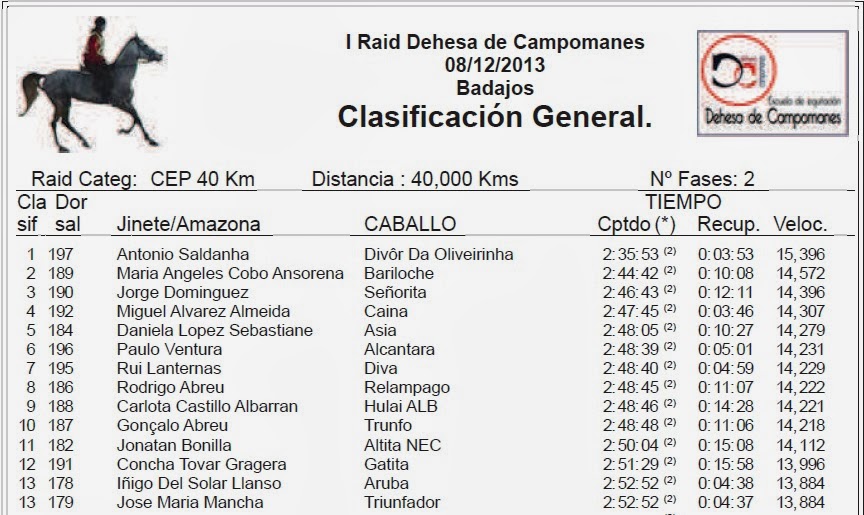 Resultados del I Raid Hípico Dehesa de Campomanes en Badajoz, celebrado hoy domingo 8 de Diciembre de 2013.