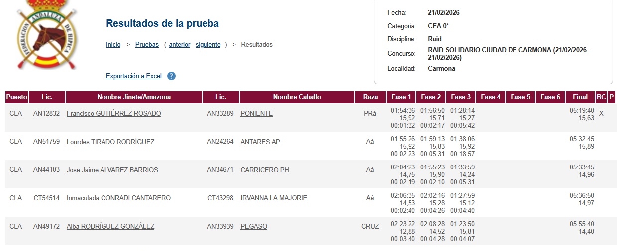 Estos son los Resultados del I Raid Solidario Ciudad de Carmona (Sevilla) Los Superhéroes. Prueba organizada por el Club Caballistas de Carmona. Que se ha corrido el día 21 de Febrero de 2025.