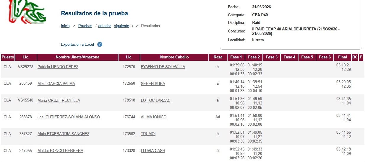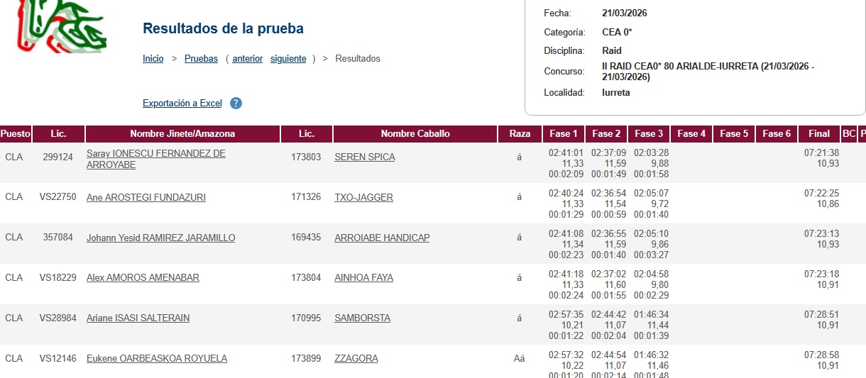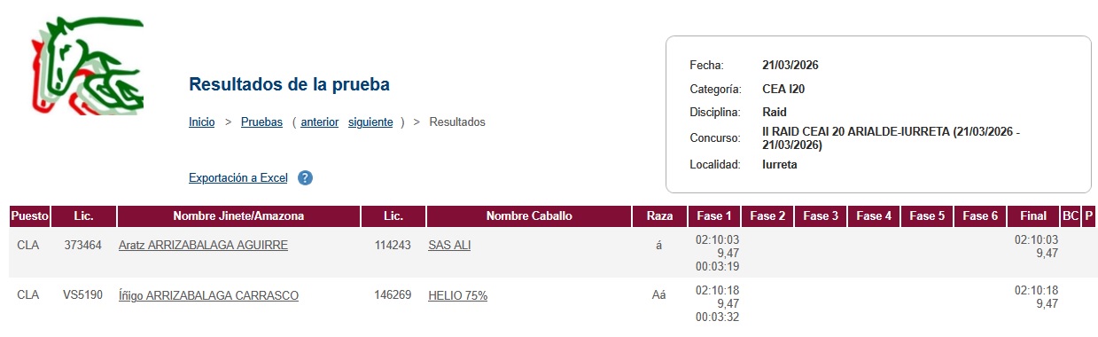 Estos son los Resultados del II Raid Hípico Arialde en Iurreta (Bizkaia),  Ciclo de Caballos Jóvenes de Raid de AECCA, prueba organizada por  Laisa Stables . Que se corrió el día 21 de Marzo de 2026.