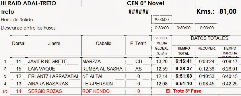 Resultados del III Raid Hípico Adal-Treto (Cantabria), corrido este pasado sábado día 21 de Septiembre de 2013, donde se corrió el Campeonato de Cantabria.
