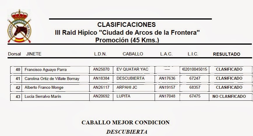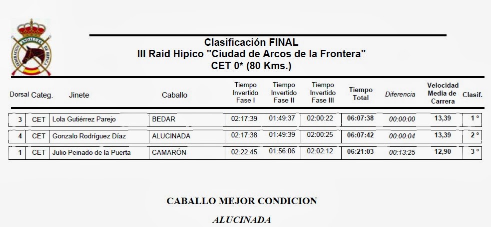 Resultados del III Raid Hípico «Ciudad de Arcos de la Frontera» (Cádiz), que se ha corrido en el día de hoy 119 de Octubre de 2013.