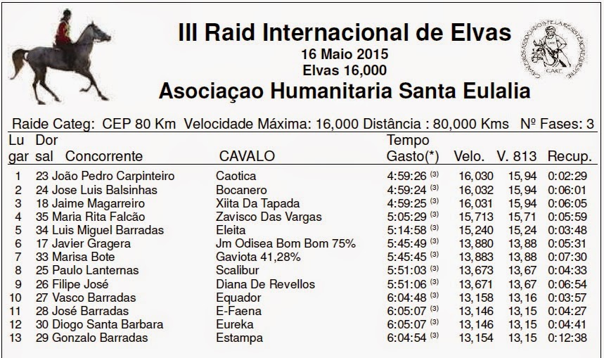 Resultados del III Raid Hípico Internacional de Elvas (POR), prueba que se ha corrido en el día de hoy 16 de Mayo de 2015.