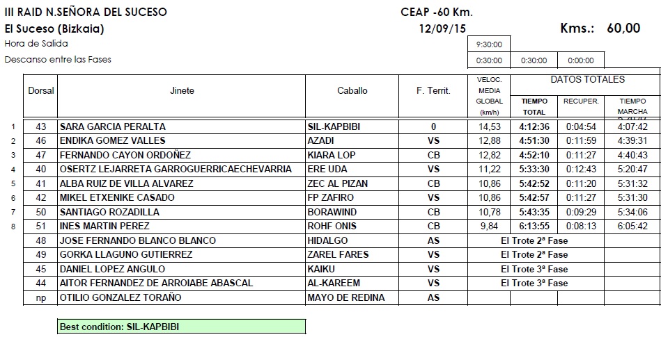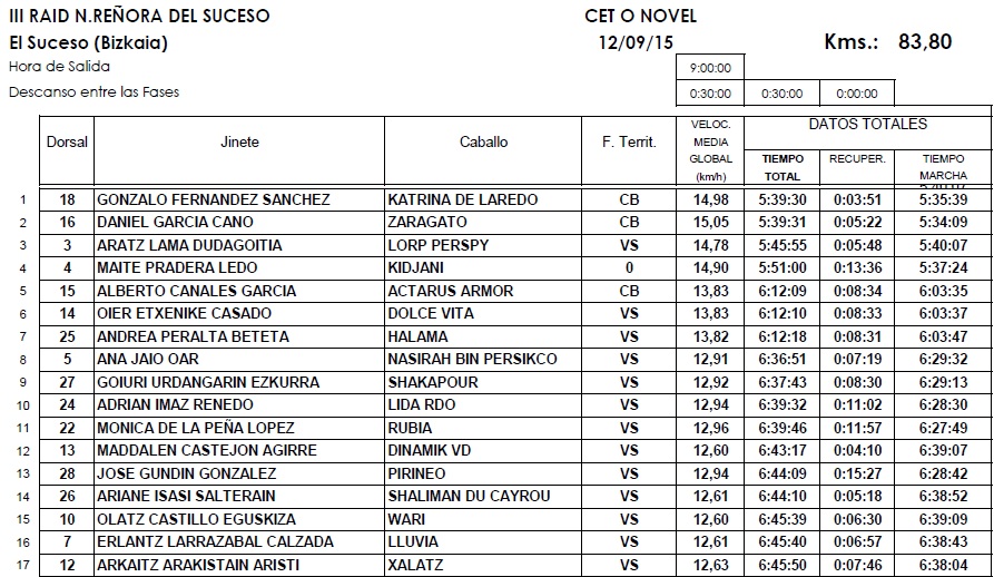 Resultados del III Raid Hípico Nuestra Señora del Suceso en El Suceso (Bizkaia), prueba que se corrió el pasado sábado día 12 de Septiembre de 2015.