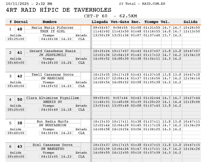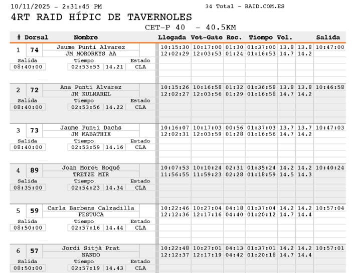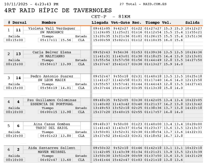 Estos son los Resultados del IV Raid Hípico de Tavernoles (Barcelona), prueba organizada por Dachas Endurante y Federación Hípica Catalana. Que se ha corrido en el día de hoy 11 de Octubre de 2025.