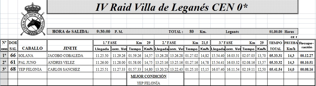 Resultados del IV Raid Hípico Villa de Leganes (Madrid).