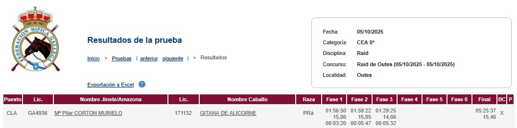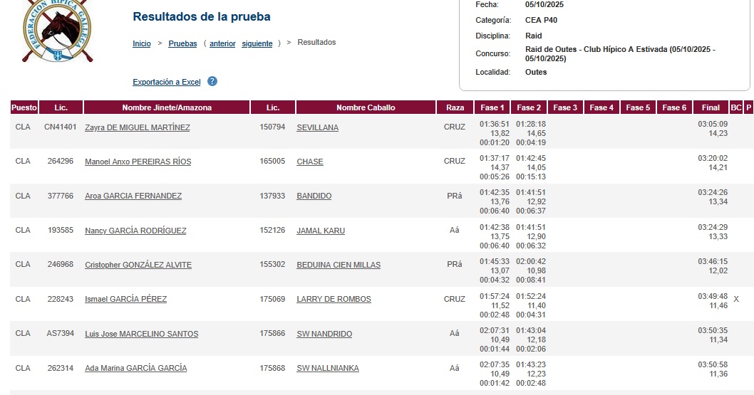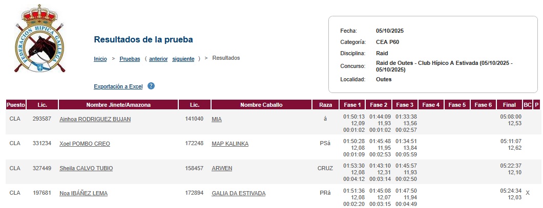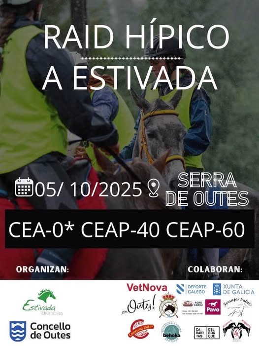 Estos son los Resultados del Raid Hípico A Estivada á Serra de Outes en el Concello de Outes (Coruña). Prueba organizada por el Club Hípico A Estivada/Concello de Outes. Que se corrió en el día de ayer día 5 de Octubre de 2025.