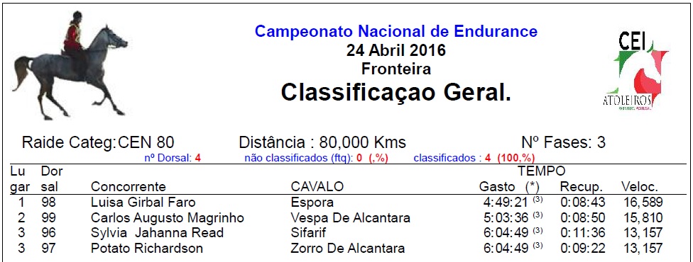 Resultados del Raid Hípico de Atoleiros en Fronteira (Portugal), de las pruebas que se han celebrado en el día de hoy 24 de Abril de 2016.
