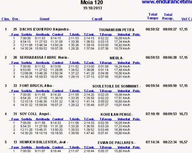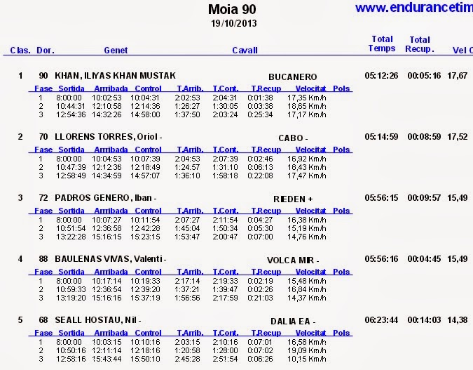 Resultados del raid Hípico Hípico de Moiá (Barcelona), corrido en el día de hoy 19 de Octubre de 2013.