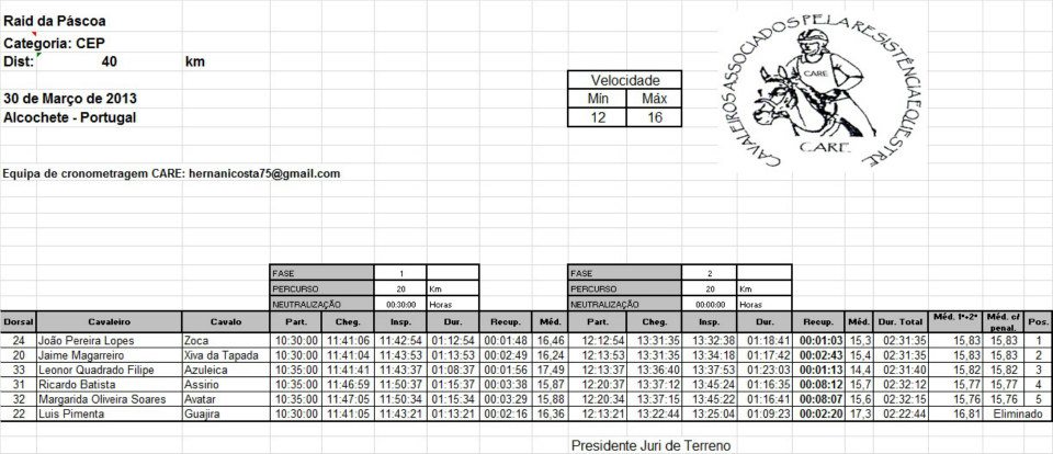 ClasificacionesRAID Resultados del Raid Hípico de Páscoa Barroca D`Alva (POR). 30 marzo, 2013 Gabriel Gamiz 0 comentarios (POR)., del Raid Hípico de Páscoa Barroca D`Alva, Resultados Resultados del Raid Hípico de Páscoa Barroca D`Alva (POR). Resultados del Raid Hípico de Páscoa en Barroca D´Alva- Alcohete (Portugal), corrido en esta mañana del día 30 de Marzo de 2013. CEP de 80 Km. CET de 40 Km. Saludos de Gabriel.