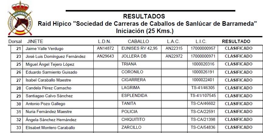Resultados del Raid Hípico de «Sociedad de Carreras de Caballos de Sanlúcar de Barrameda» (Cadiz).