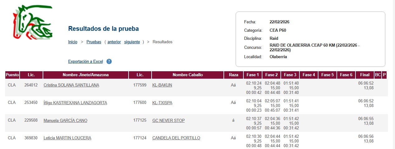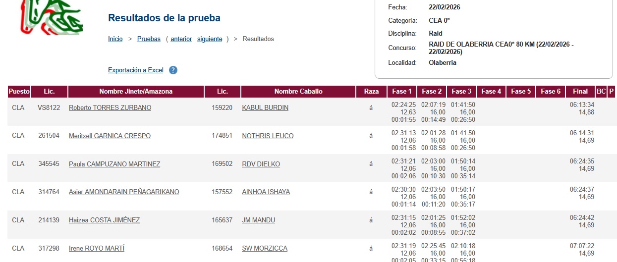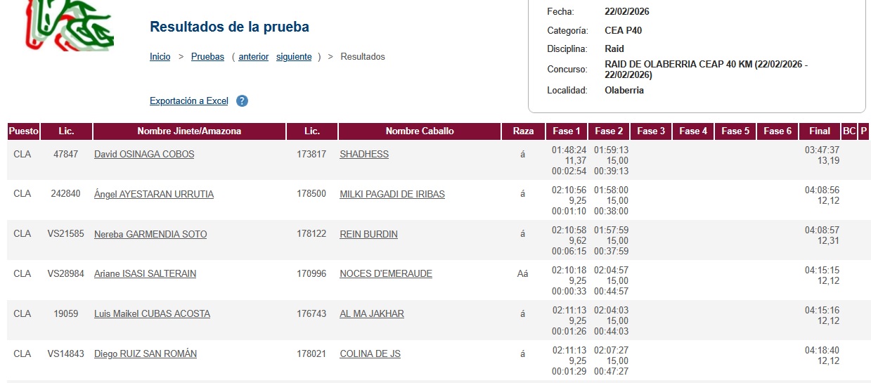Estos son los Resultados del Raid Hípico del Ayuntamiento de Olaberria (Guipúzcoa). Ciclo de Caballos Jóvenes de AECCA, organizado por Orue Endurance. Que se ha corrido el día 22 de Febrero de 2026.