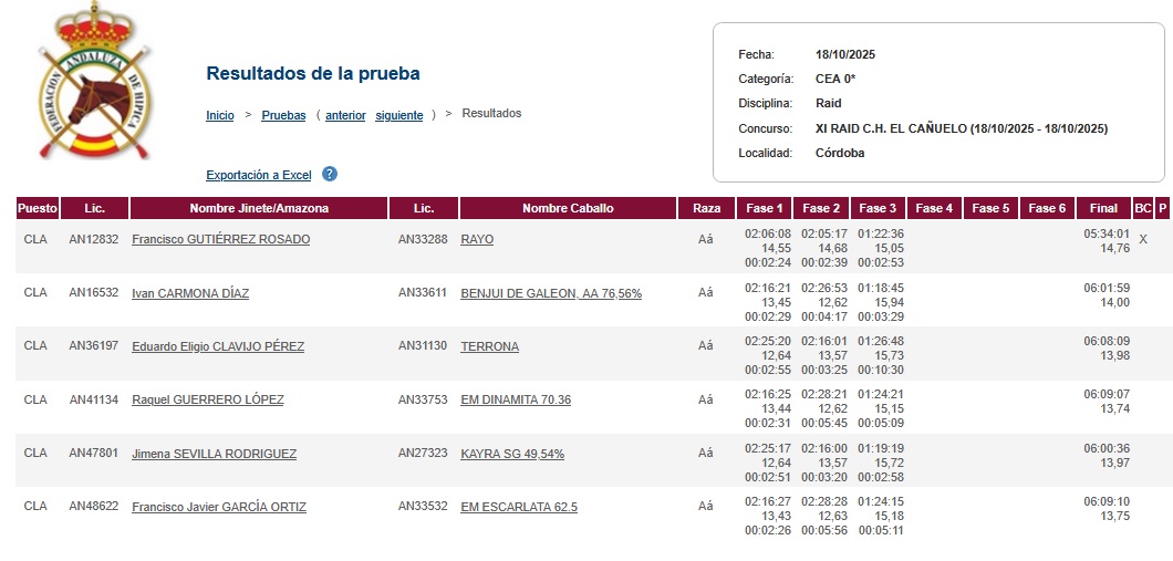 Estos son los Resultados del Raid Hípico el Cañuelo (Córdoba), Prueba organizada por el Centro Ecuestre el Cañuelo. Y Por el C.D. Los Soberbios Equipo de Resistencia Ecuestre. Que se ha corrido el día 18 de Octubre de 2025.