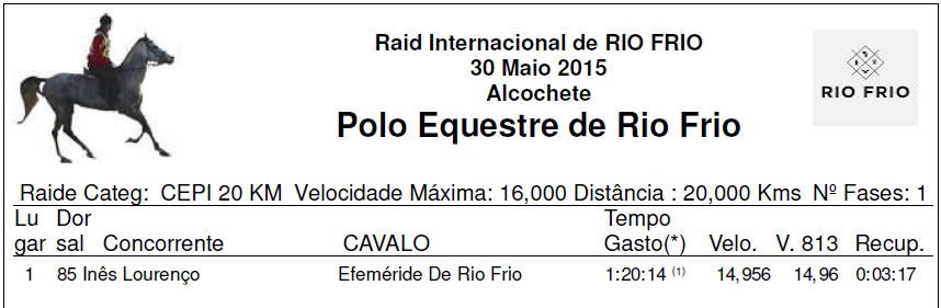 Resultados del Raid Hípico Internacional de Rio Frio en Alcochete (POR), prueba celebrada en el día de ayer 30 de Mayo de 2015.
