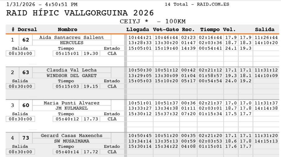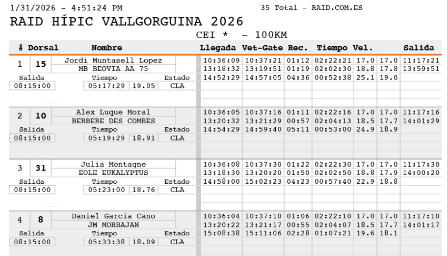 Estos son los Resultados de las pruebas Internacionales del Raid Hípico Vallorguina (Barcelona), prueba organizada por el Endurance Club Hipic Y CLUB HÍPIC BAIX MONTSENY. Que se ha corrido el día 31 de Enero de 2026.
