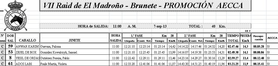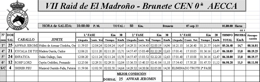 Resultados del VII Raid de El Madroño- Brunete (Madrid), corrido este pasado sábado día 7 de Septiembre de 2013. Final de las Pruebas AECCA.
