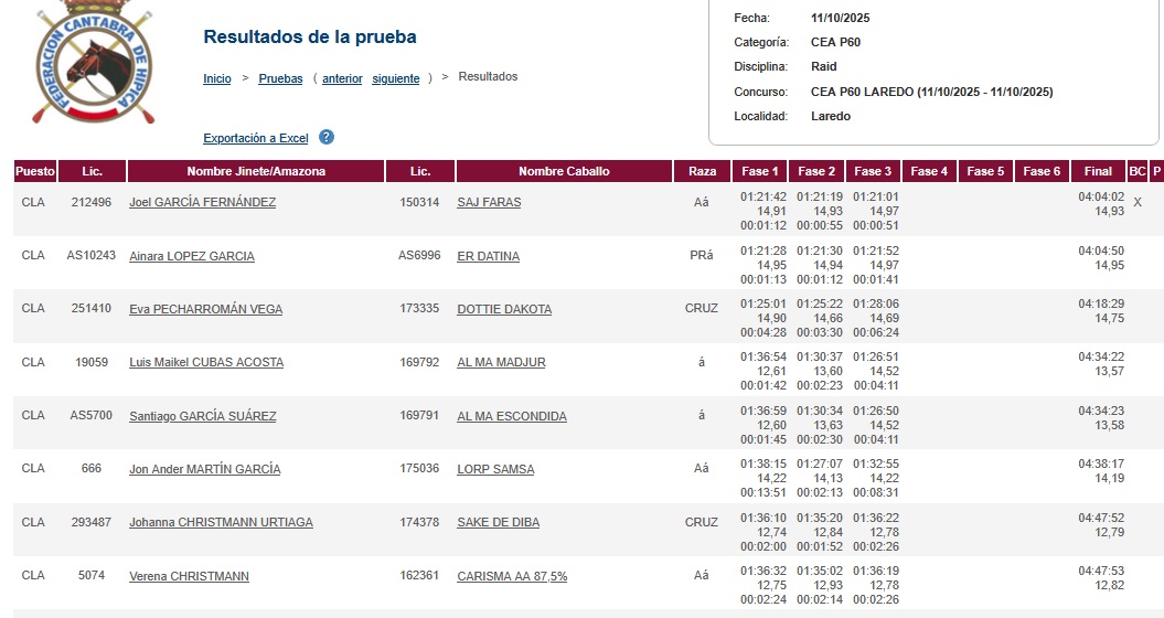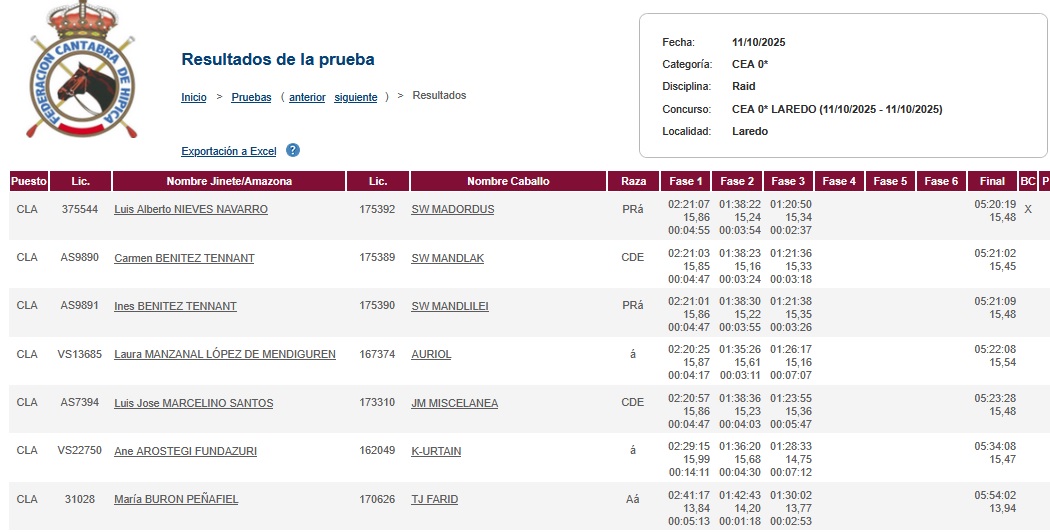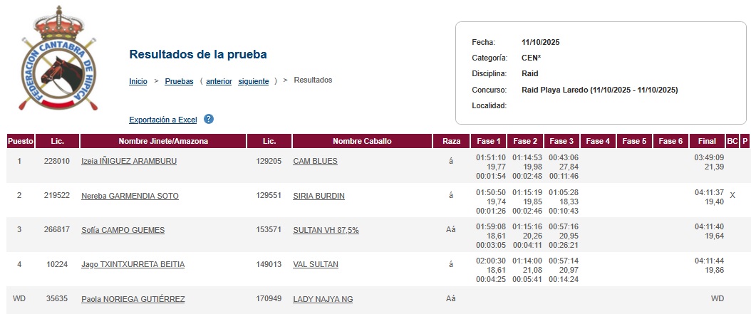 Por fin ya han salido publicados los Resultados del VIII Raid Hípico Playa de Laredo (Cantabria), y Ciclo de Caballos Jóvenes de AECCA.. Prueba organizada por el Ayuntamiento de Laredo. Que se ha corrido el día 11 de Octubre de 2025.