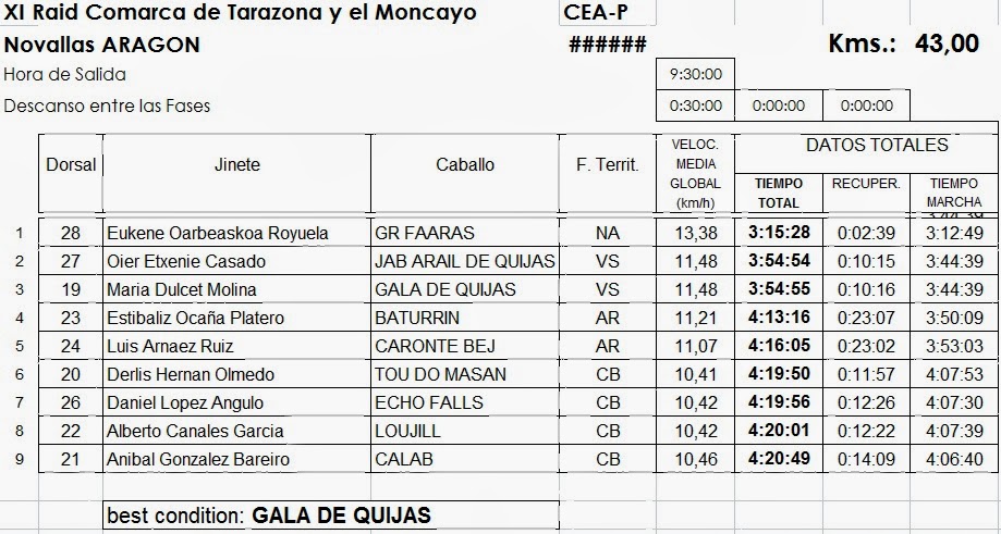 Resultados del XI Raid Hípico «Comarca de Tarazona y el Moncayo» en Novallas Aragón.