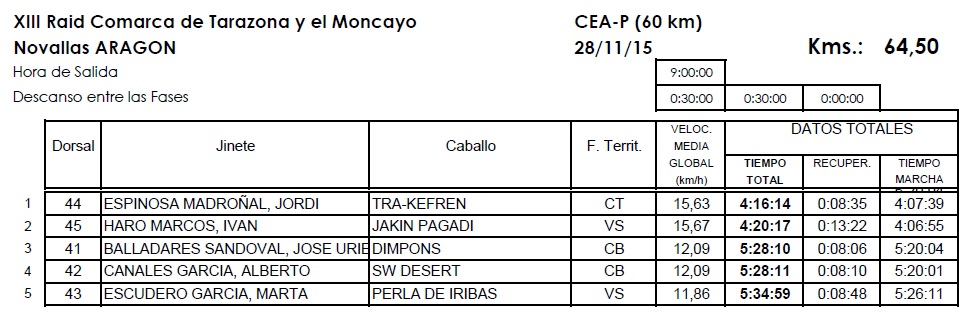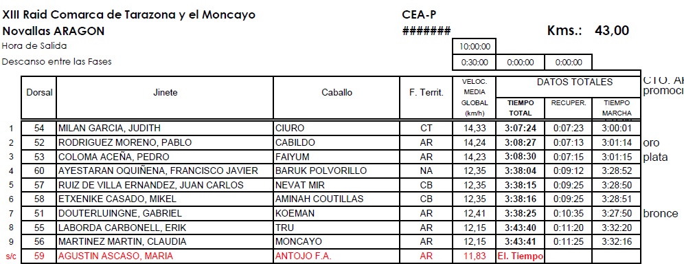 Resultados del XIII Raid Hípico Comarca de Tarazona y el Moncayo en Novallas (Zaragoza).