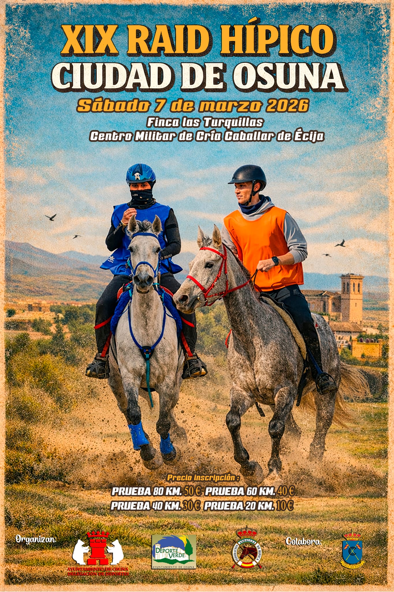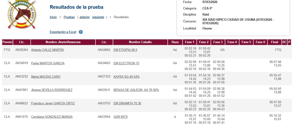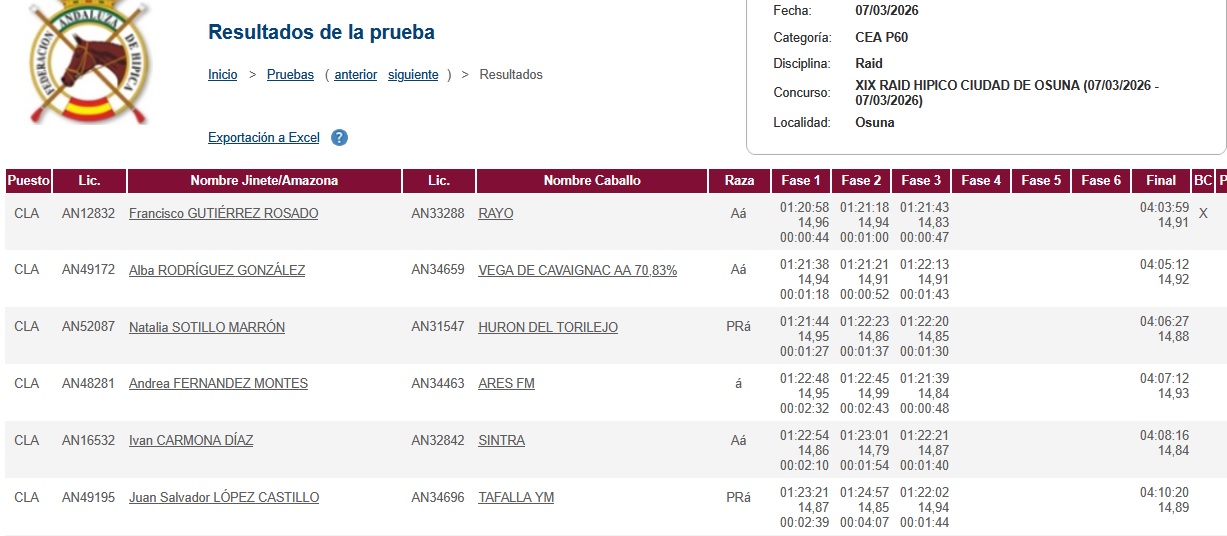 Estos son los Resultados del XIX Raid Hípico Ciudad de Osuna – Las Turquillas, (Sevilla). En Centro Militar de Cría Caballas de Écija. Prueba organizada por el Ayuntamiento de Osuna. Que se ha corrido el día 7 de Marzo de 2026.